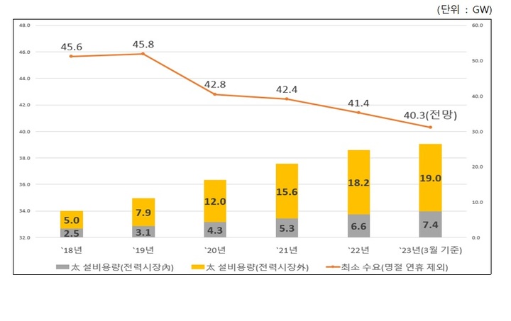 하지만 점차 태양광 발전 보급이 누적되면서 올해부터 근로자의 날이나 어린이날 등 연휴와 주말 등에 전력수급이 불균형한 문제가 발생할 수 있다는 예측이 나온다.