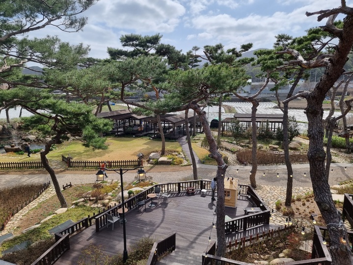 힐링정원카페 무타블랑의 또 다른 볼거리는 카페 내부에 자리 잡은 120년이 넘는 오랜 수령의 아름드리 소나무 두 그루다.