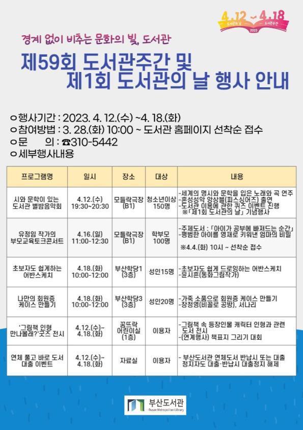 [부산=뉴시스]백재현 기자 = 부산도서관은 제59회 도서관 주간을 맞아 오는 4월 12일부터 18일까지 시민들이 즐길 수 있는 다양한 복합문화행사를 개최한다.
