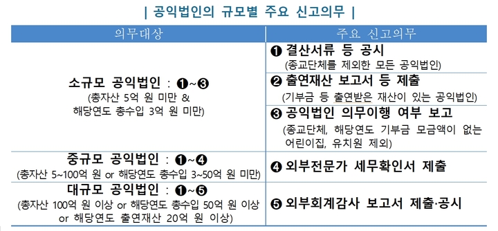또한 일정 규모 이상인 공익법인은 '외부전문가 세무확인서', '외부회계 감사보고서'도 함께 제출해야 한다.