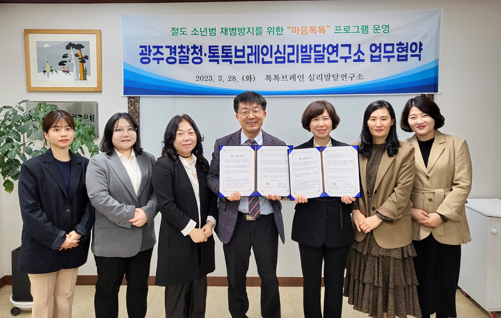 [광주=뉴시스] 변재훈 기자 = 광주경찰청은 28일 범죄에 노출된 청소년들을 위해 전문 상담기관인 '톡톡브레인 심리발달연구소'와 업무협약을 맺었다고 밝혔다.