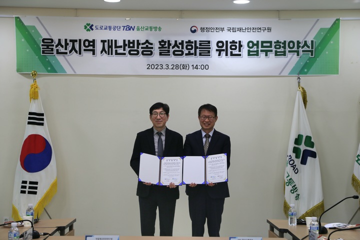 [울산=뉴시스]박수지 기자 = 도로교통공단 TBN울산교통방송은 28일 국립재난안전연구원과 재난으로부터 안전한 울산을 만들기 위해 업무협약식을 가졌다.