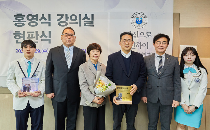 인하대학교는 29일 5호관에서 ‘홍영식 강의실’ 현판식을 열었다. 현판식에는 조명우 총장, 김웅희 대외부총장, 홍영식 동문의 부인 이종옥씨, 장남 홍동표씨, 차남 홍정표씨 등이 참석했다.