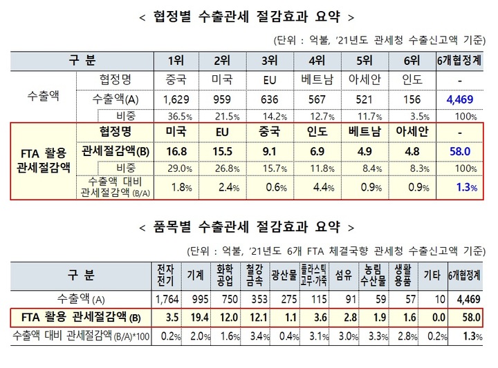 산업부는 지난 2021년 한 해 우리나라가 미국과 유럽연합(EU), 중국, 인도, 베트남, 아세안(ASEAN) 사이 FTA에서 절감한 관세를 계산한 결과 이같이 밝혔다.