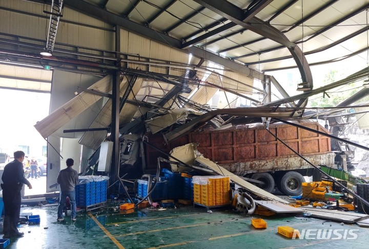 [경주=뉴시스] 이은희 기자 = 20일 오전 10시17분 경북 경주시 외동읍 문산리에서 5t 집게차가 공장으로 돌진, 2명이 중경상을 입었다.