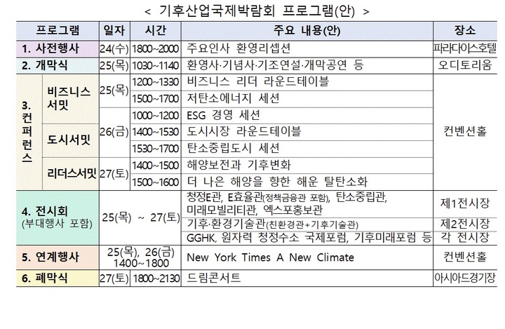 기후박람회에는 기후에너지 분야 국내외 기업과 주요국 정부, 국제기구 인사, 학계 관계자 등이 참여했다. 첫날 개막식과 더불어 콘퍼런스(비즈니스·도시·리더스·서밋), 전시회 등 다채롭게 구성됐다.