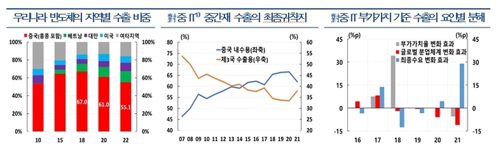 중국은 IT제품 생산지로서 역할 축소, 소득수준 상승에 따른 IT기기 수요 확대 등으로 최종 수요처로서의 중요도가 확대되면서 대(對)중 반도체 수출에서 제3국 수출용 비중이 축소되고 중국 내수용 비중이 상승했다.