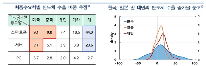 우리나라 반도체의 최종수요 구조를 살펴보면 용도별로는 스마트폰과 서버, 지역별로는 미국과 중국에 대한 의존도가 높은 것으로 나타났다. 특히 용도별로 보면 스마트폰 수요(44.0%)에 가장 큰 영향을 받고 다음으로는 서버(20.6%)의 영향이 큰 것으로 추정됐다.