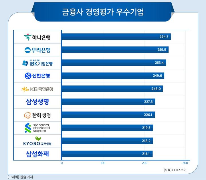 30일 기업데이터연구소 CEO스코어가 국내 금융사 123곳을 대상으로 실시한 '올해의 그레이트 컴퍼니(Great Company)' 평가에서 하나은행이 300점 만점에 최고점인 264.7점을 받아 종합 1위를 차지했다.