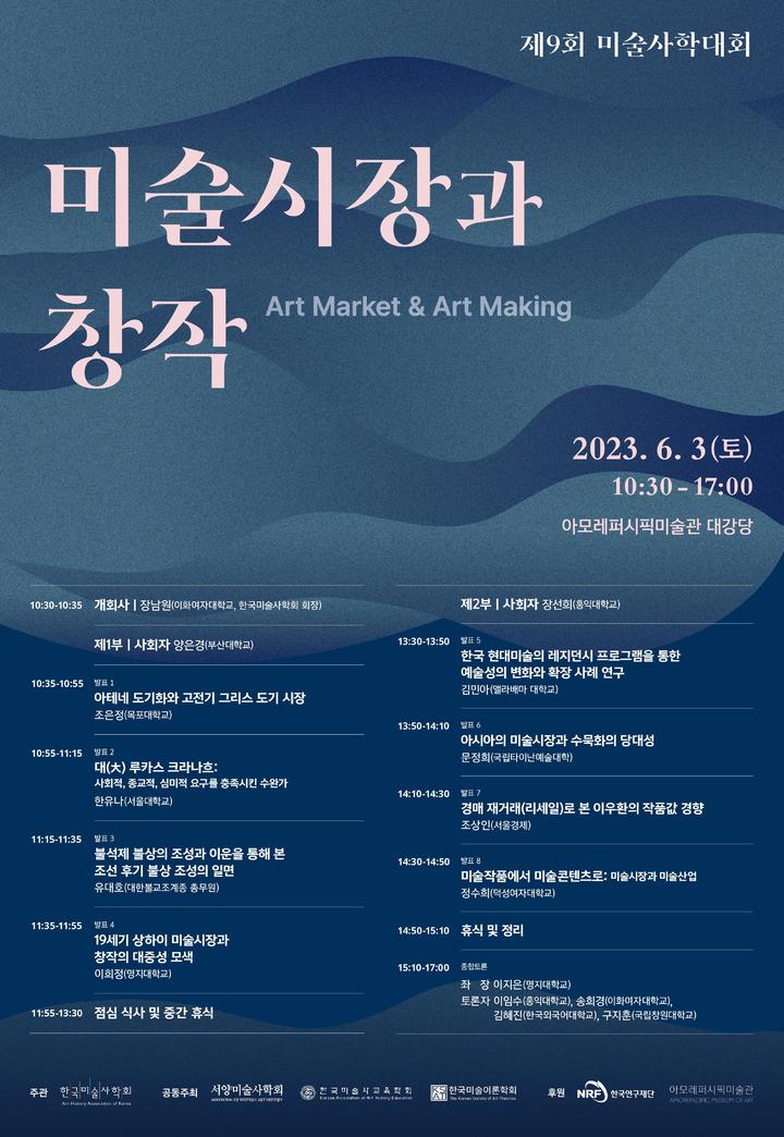 이번 미술사학대회는 ‘미술시장과 창작’을 주제로 미술작품의 제작과 소비에 있어 그 역할이 점차 커지고 있는 ‘미술시장’에 대해 주목한다. 1부에서는 서양 고대부터 중국 근대까지 미술시장이 창작에 미친 영향을 다룬 4편의 논문이 발표되고, 2부에서는 20세기 후반부터 2020년까지 한국과 홍콩 아트페어 관련 4편의 주제 발표가 이어진다.