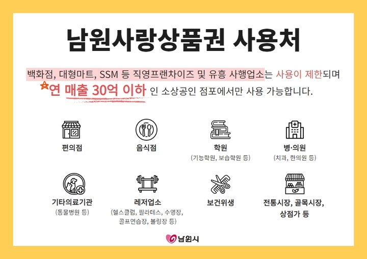 30일 시에 따르면 행안부 '2023년 지역사랑상품권 발행지원사업 종합지침'에 따라 연 매출 30억원을 초과하는 업소는 가맹점 등록이 제한되며 기존 가맹점 역시 등록이 취소된다. 행안부의 이 기준을 적용할 경우 남원에서는 100여개 업체의 가맹점 등록이 해지될 예정으로 해당 사업장에서는 더이상 남원사랑상품권을 사용할 수 없게 된다.