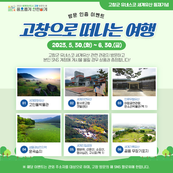 이벤트는 고창의 유네스코 세계유산 관련 관광지를 모두 방문한 뒤 본인의 SNS계정에 인증하는 것으로 참여할 수 있다.