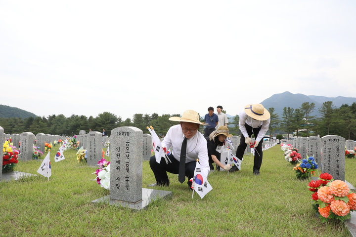 이경열 대전국세청장과 임직원, 대전 시내 세무서장 등 80여명은 1일 현충원 장병 제2묘역에 태극기를 새로이 꽂고 묘역 주위 환경을 정화했다.
