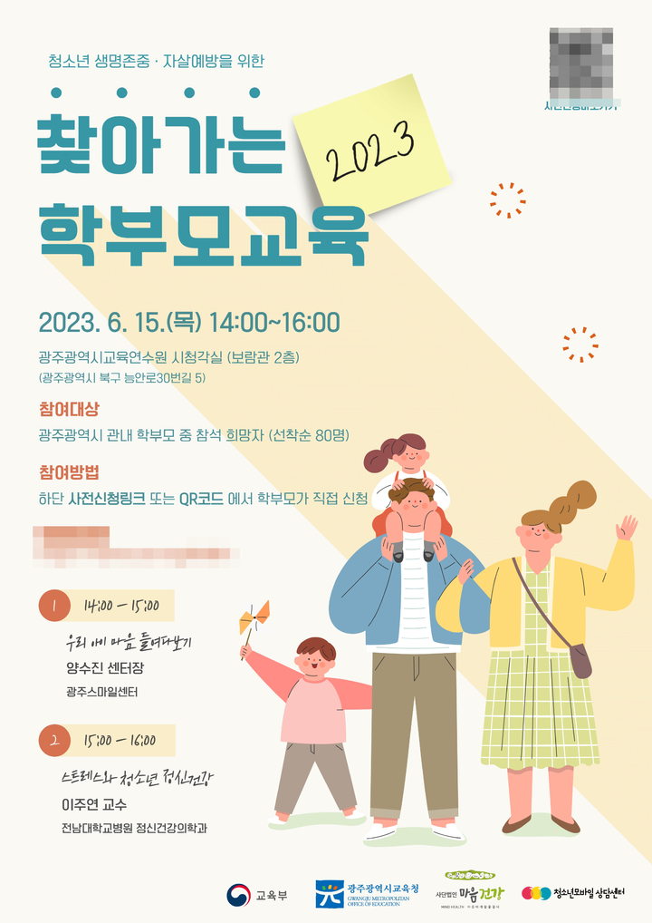 광주시교육청은 15일 오후 2시 광주교육연수원 시청각실에서 '청소년 생명존중·자살예방을 위한 2023년 찾아가는 학부모교육'을 실시한다고 2일 밝혔다.