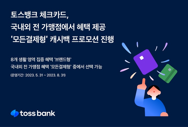 [서울=뉴시스]이주혜 기자 = 토스뱅크가 국내외 전 가맹점에서 혜택을 받을 수 있는 토스뱅크 체크카드 '모든결제형' 캐시백 프로모션을 진행한다고 2일 밝혔다.