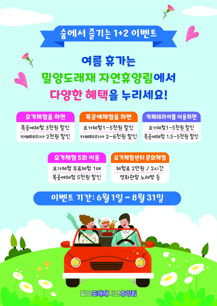 이벤트는 누구나 이용할 수 있으며, 요가체험센터 문화체험은 객실 이용객이 신청 대상이다. 할인권 및 쿠폰 교환은 당일 결제 영수증만 적용하며, 이벤트 쿠폰의 사용기간은 8월 31일까지다.