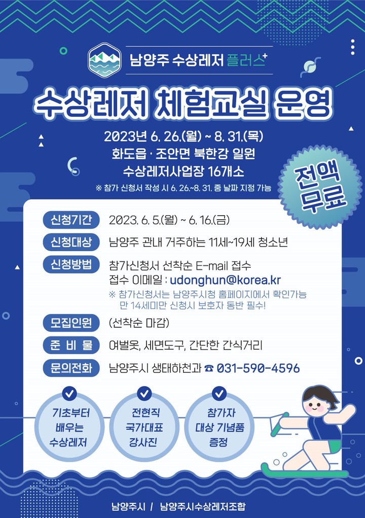 [남양주=뉴시스]이호진 기자 = 경기 남양주시는 6월부터 8월까지 운영되는 수상레저 플러스(+) 체험교실에 참가할 청소년을 모집한다고 3일 밝혔다.