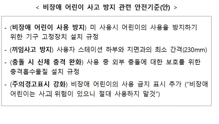 개정안은 장애 어린이가 휠체어나 유모차를 타고 그네에 탑승해 이용하는 그네에 대한 안전 기준을 마련하기 위한 것이다. 비장애 어린이의 안전사고를 예방하기 위해 이미 행정예고한 안전 기준을 보완했다.