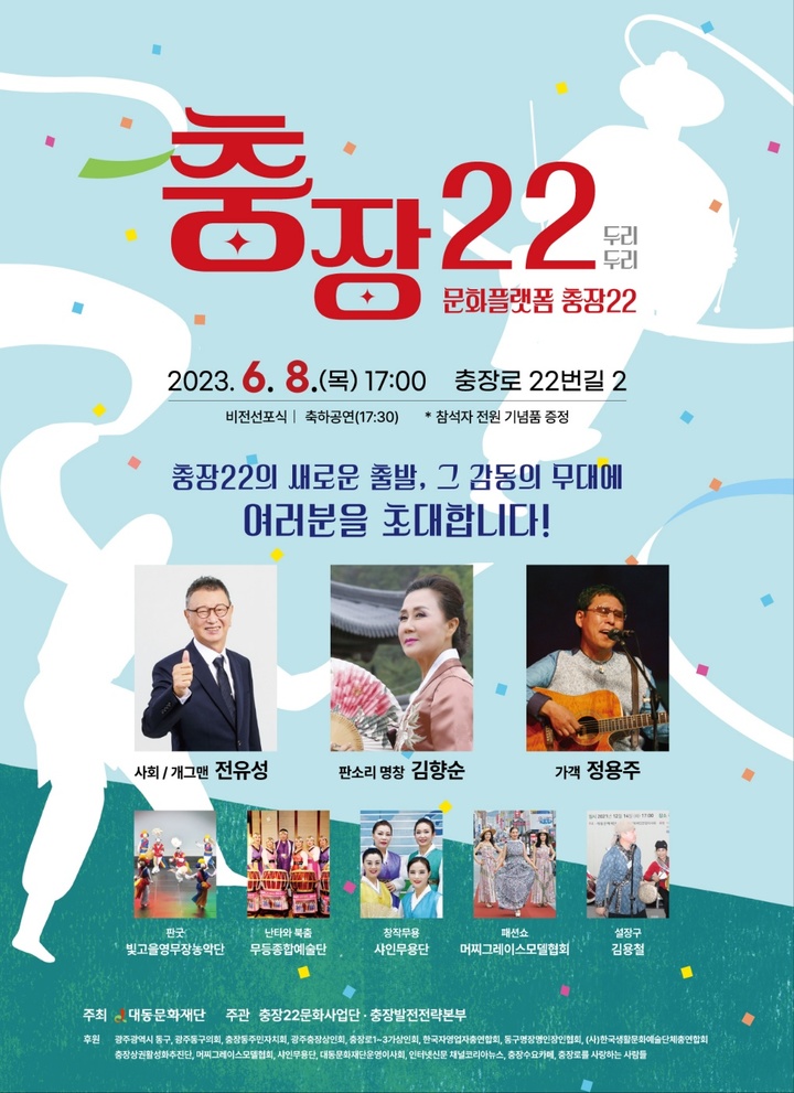 또 충장22의 새 위탁 운영 기관으로 선정된 (사)대동문화재단의 비전선포식도 진행한다. 재단은 충장22를 문화예술인들이 머물며 창작하는 공간의 산실이 될 수 있도록 지원에 나설 방침이다.