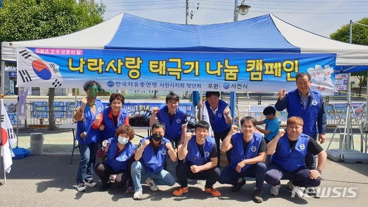 [사천=뉴시스] 차용현 기자 = 경남 사천시 한국자유총연맹 사천시지회 청년회가 지난 4일 탑마트 사천점 앞에서 현충일을 앞두고 나라사랑 태극기 나눔 캠페인을 실시했다고 5일 밝혔다.