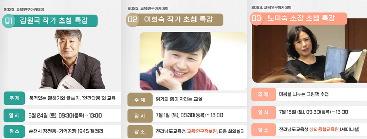 같은달 15일에는 노미숙 그림책연구소 소장이 '마음을 나누는 그림책 수업'을 주제로 학급운영과 연계한 독서·인문 교육에 대해 강의한다.