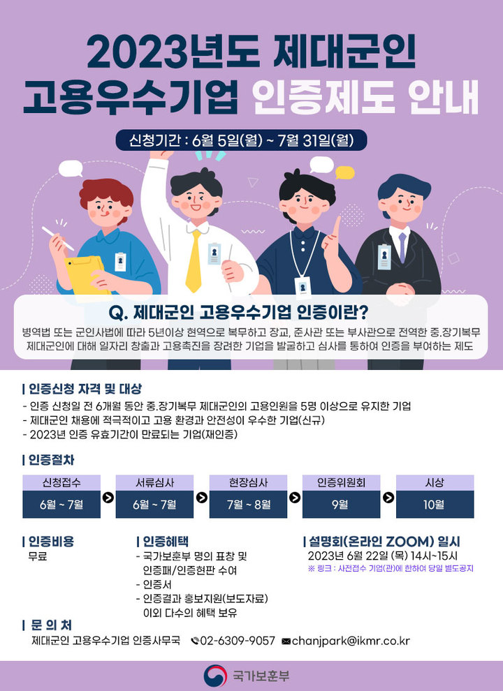 [서울=뉴시스] 옥승욱 기자 = 국가보훈부는 2023 제대군인 고용우수기업 인증제’ 신청을 오는 7월 31일까지 받는다고 7일 밝혔다.