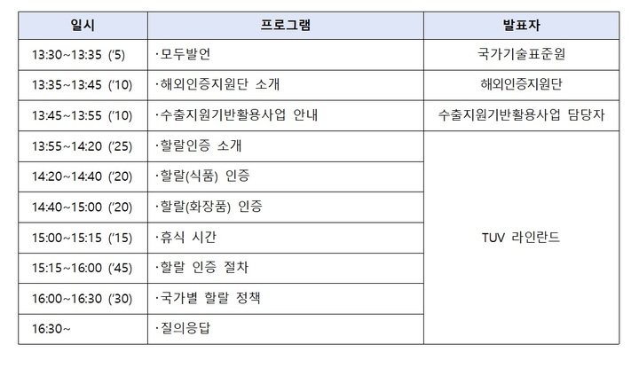 이에 국표원 해외인증지원단은 '한국화학융합시험연구원(KTR)'과 'TUV라인란드'와 함께 식품·화장품의 할랄인증에 필수적인 정보를 제공하고, 현장에서 해외인증 전문가 상담을 통해 기업 맞춤형 상담을 실시했다.