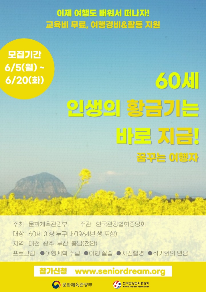 중앙회는 지난 4월 '2023 꿈꾸는 여행자' 과정을 전국으로 확대했으며, 3차로 오는 20일까지 부산·광주·충남·대전 과정 수강생을 모집한다. 이달 말까지 60세 이상(1964년생 포함)이면 누구나 꿈꾸는 여행자 홈페이지를 통해 지원할 수 있다. 선발자는 오는 6월 23일 발표된다.