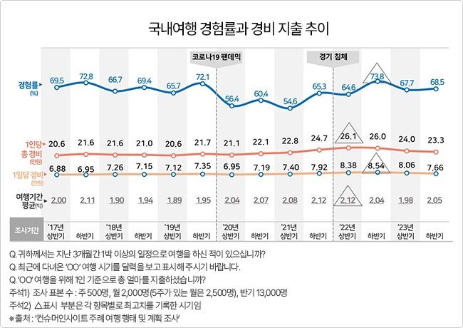 올해 하반기(7·8월) 조사에 참여한 이들 10명 중 7명(69%)은 최근 3개월 내 평균 2.05박의 국내여행을 다녀왔다고 답했다. 총 여행경비는 1인당 23만3000원, 1일당 7만6600원이었다.