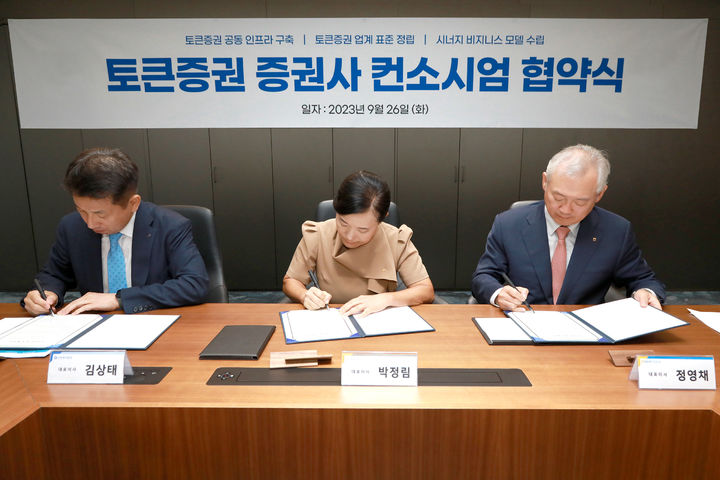 [서울=뉴시스]우연수 기자 = KB증권, 신한투자증권, NH투자증권은 토큰증권 시장 공동 진출을 위해 '토큰증권 증권사 컨소시엄 구성' 전반에 대한 업무협약을 체결했다고 2일 밝혔다.