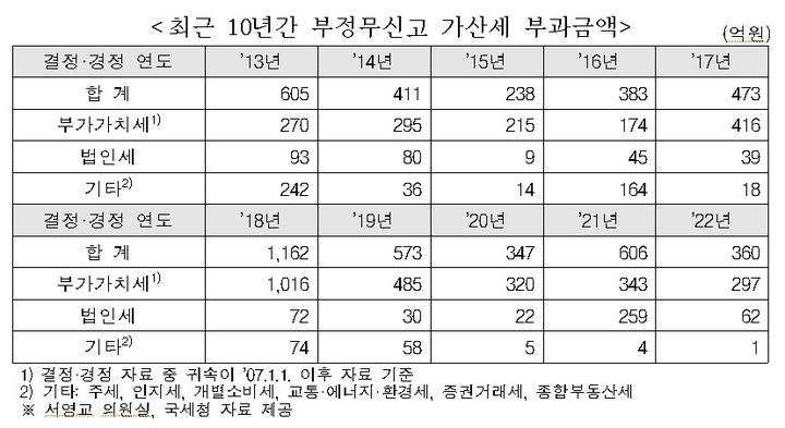 1일 국회 기획재정위원회 소속 서영교 더불어민주당 의원이 국세청에 요구한 자료에 따르면 2013년부터 2022년까지 최근 10년간 제대로 신고·납부하지 않은 세금에 매겨지는 가산세 규모는 총 33조3711억원으로 집계됐다.