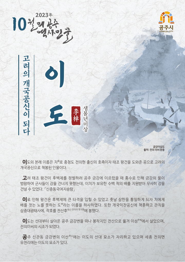 조병철 문화재과장은 “공주 금강을 터전으로 하여 고려의 개국공신이 되었던 이도의 업적을 기리기 위해 10월의 역사인물로 선정했다”라며 “10월 중 시민을 대상으로 관련 행사를 개최할 예정”이라고 말했다.