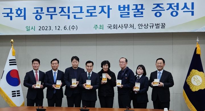 국회사무처 주관으로 열린 이날 증정식에는 주호영 국민의힘 국회의원과 이광재 국회사무총장, 관리국장, 국회사무처 직원, 국회의사당내 근무중인 청소, 전기, 조경, 방호 등 현장공무직근로자 대표가 참석했다.