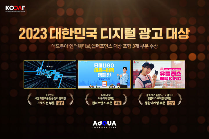 14일 서울 삼정호텔에서 열린 시상식에서 애드쿠아는 ▲티머니GO '이동이득 캠페인'으로 앱퍼포먼스 부문 대상 ▲HL만도 '세상 자유로운 길을 열다 캠페인'으로 프로모션 부문 금상 ▲LG유플러스 ‘갤럭시 Z 플립5Z·폴드5 혜택킹 캠페인’으로 통합마케팅 부문 은상을 각각 수상했다.