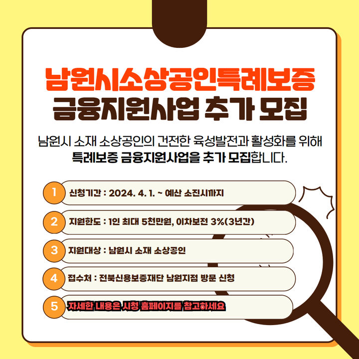 남원시 소상공인 특례보증은 관내 사업장을 두고 영업 중인 소상공인을 대상으로 업체당 최대 5000만원까지 지원하며 보증기간은 3년 이내다.