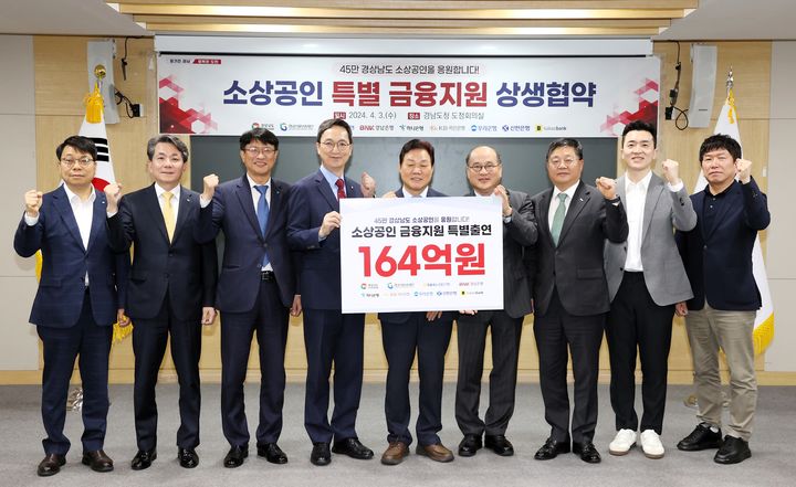 박완수 경남도지사와 조청래 NH농협은행 경남본부장, 이효근 경남신용보증재단 이사장을 포함한 관내 금융기관 대표들이 참석해 총 2160억원 규모의 ‘경상남도 소상공인 특별 금융지원 상생협약’을 체결했다.
