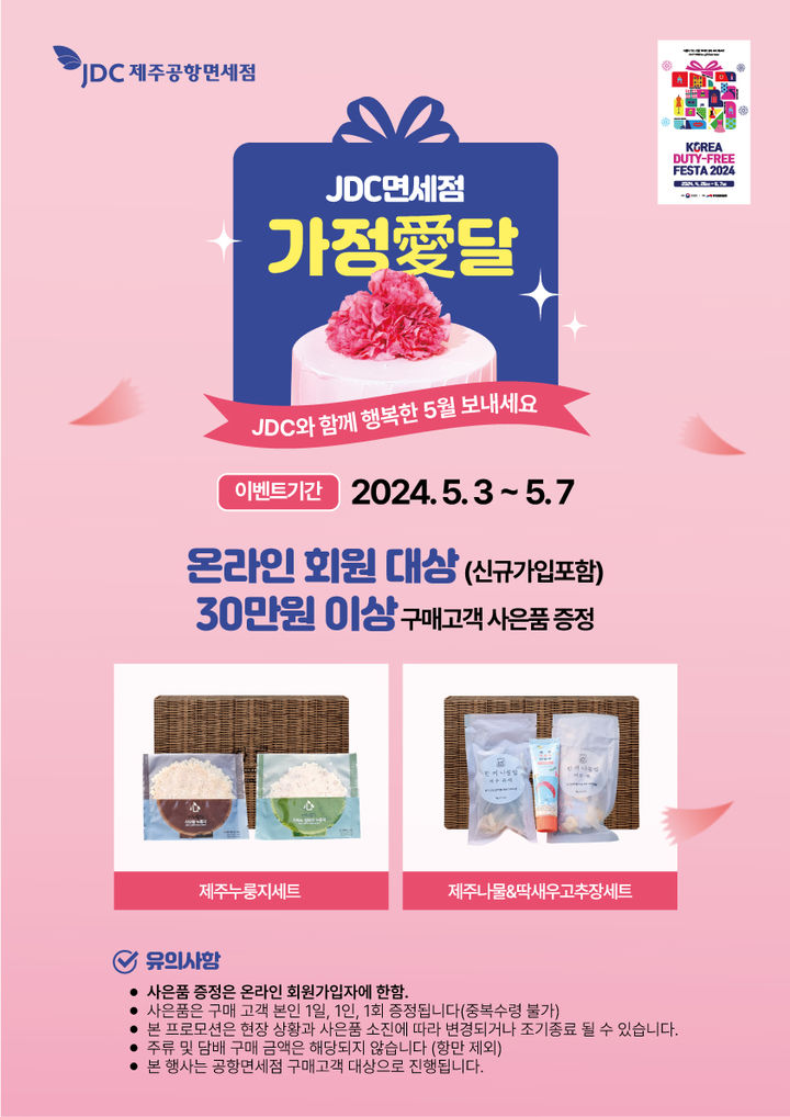 [제주=뉴시스] 이정민 기자 = 제주국제자유도시개발센터(이사장 양영철, JDC)가 운영하는 제주국제공항 내 JDC 면세점에서 5월 ‘가정愛달’ 사은행사 및 경품 이벤트 등 다양한 마케팅 프로모션을 진행한다.
