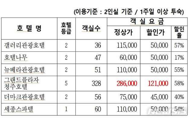 그랜드플라자를 비롯해 ▲세종스파텔 ▲호텔나무 ▲갤러리 ▲뉴베라 ▲더마크 등 6개 호텔은 기존 숙박료에서 17~58%를 할인한다. 총 객실수는 578개다.