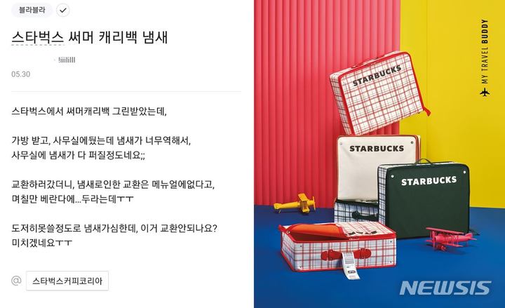 직장인들이 많이 찾는 블라인드 게시판에는 "가방을 받고 사무실에 뒀는데 냄새가 너무 역해서 사무실에 다 퍼질 정도"라며 "교환하러 스타벅스를 방문했더니 냄새로 인한 교환은 메뉴얼에 없다고 해서 미칠 지경"이라는 글이 올라왔다.