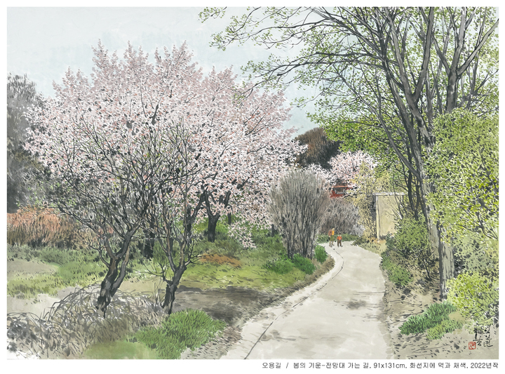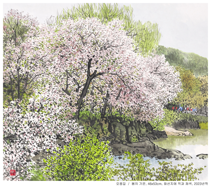 수묵채색화 대가 오용길(76) 화백은 부지런하다. 올해도 어김없이 봄 기운을 선사한다. 매년 봄이면 하얀 벚꽃과 노란 산수유, 연두빛 싹이 올라온 초록 나무들을 기운생동하게 화폭에 담아왔다. 언제인지도 모르게 후드득 떨어져버린 벚꽃이 그림 속에서는 눈부시게 흐드러져 눈길을 끈다.