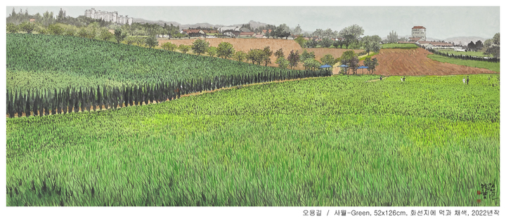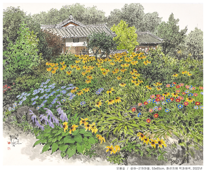 수십 번 수백 번 잔잔하고 부드럽게 올린 '붓 놀림'은 50년 내공을 보여준다. 빨리빨리 변하는 세상에서도 오랜 시간을 녹인 '오용길 표 수묵 채색화'가 여전히 에너지가 충만한 배경이다.