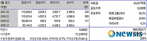 이 중 최대주주 및 특수관계인 등(한화건설 2억1604만8000주, 한화 1억8818만6000주, 한화석화 3220만4000주, 예금보험공사 2억1496만2000주)을 포함한 6억5140만 주(75.0%, 자진매각제한, 6개월)와 우리사주 3649만9000주(4.2%, 보호예수, 1년)를 제외한 상장 직후 유통가능 주식 수는 1억7370만4000주(20.0%)다.