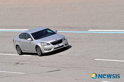다음은 4km의 고속주행로. 위험한 코스여서 전문 드라이버 옆에 앉아 속도감과 풍절음, 실내 소음을 체험했다. 일본차나 K7 모두 시속 200km를 넘는 속도에서는 외부 풍절음이 있었다. 하지만 대화가 어려울 정도로 내부 소음이 심하지는 않았다. K7의 최고 속도는 250km. 계기판에는 260km까지 표시돼 있지만 안전을 위해 250km에 속도제한이 걸려있다.
