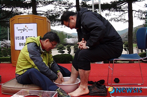 <사진설명>송인회 극동건설 회장(왼쪽)은 지난 23일 '창립63주년 한마음대회'에서 '깜짝 이벤트'로 직원들의 발을 씻겨주는 세족식을 진행했다.