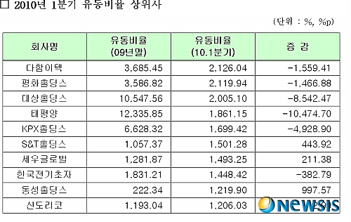 다함이텍에 이어 평화홀딩스, 대상홀딩스, 태평양, KPX홀딩스, S&T홀딩스, 세우글로벌, 한국전기초자, 동성홀딩스, 신도리코 순으로 단기채무지급능력이 뛰어났다.