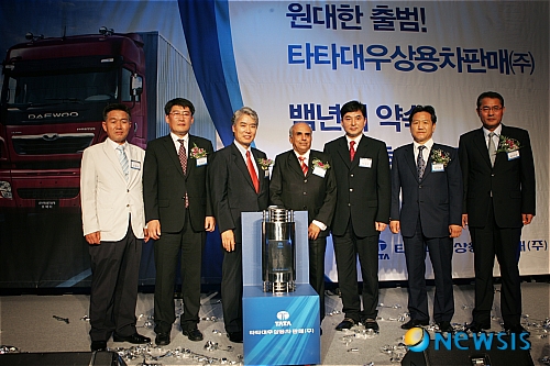 <사진설명> 지난 2일 출범식에서 기념촬영을 하고 있는 김종식 타타대우상용차 사장(왼쪽 세 번째)과 자트리아 사이트 타타대우상용차판매 사장(왼쪽 네 번째).