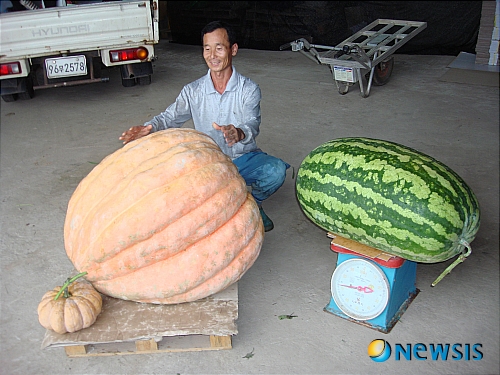 【의령=뉴시스】강종효 기자 = 국내에서 가장 큰 수박과 호박이 경남 의령에서 생산돼 화제다.