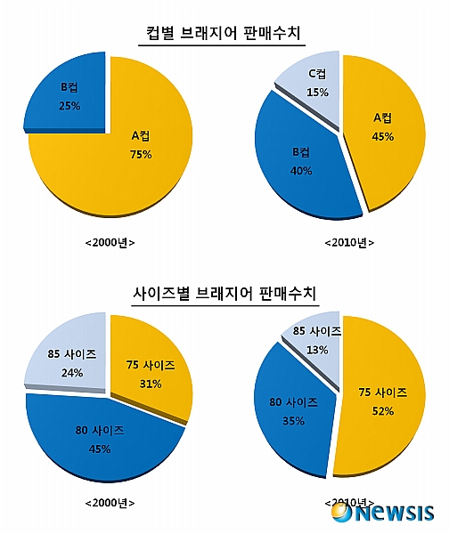 반면 밑가슴 둘레는 오히려 줄었다. 2000년 전체 판매량의 45%를 차지하며 가장 많은 판매량을 보였던 밑가슴 둘레 80사이즈는 10년새 35%로 떨어졌다.