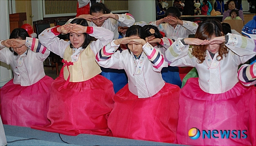 -여자는 오른손이 위로가게 포개잡고(공수·拱手) 손을 어깨 높이까지 들어 시선은 손등을 본다