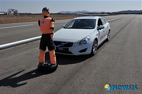 보행자 추돌방지 시스템은 30㎞/h 이하에서 운전자가 브레이크를 밟지 않아도 장애물이 있으면 자동으로 멈추는 것이다. 위험상황에도 운전자가 반응하지 않아도 S60은 운전석 앞 헤드업 디스플레이를 통해 붉은색 경고음을 보내고 그대로 멈춘다.